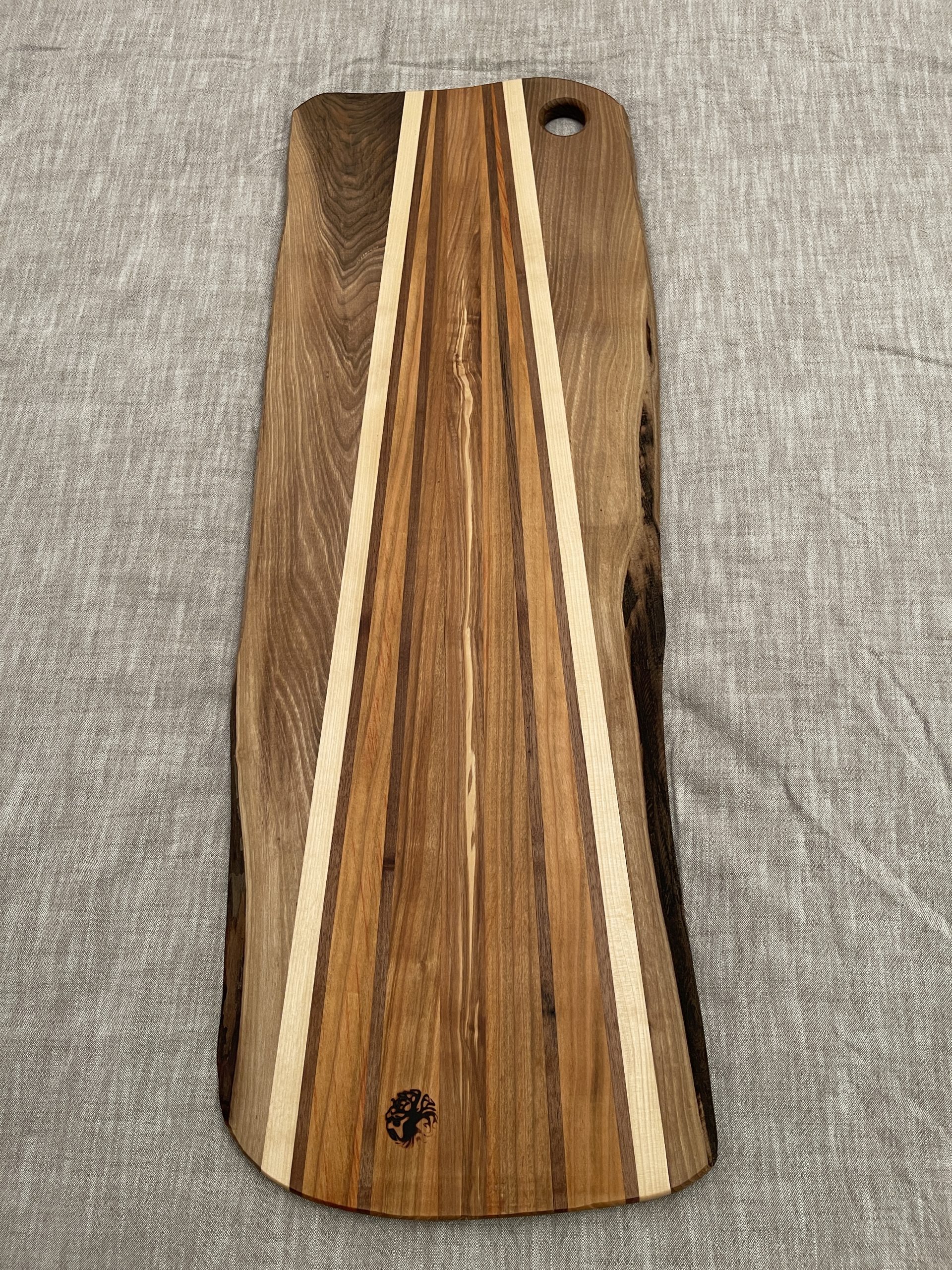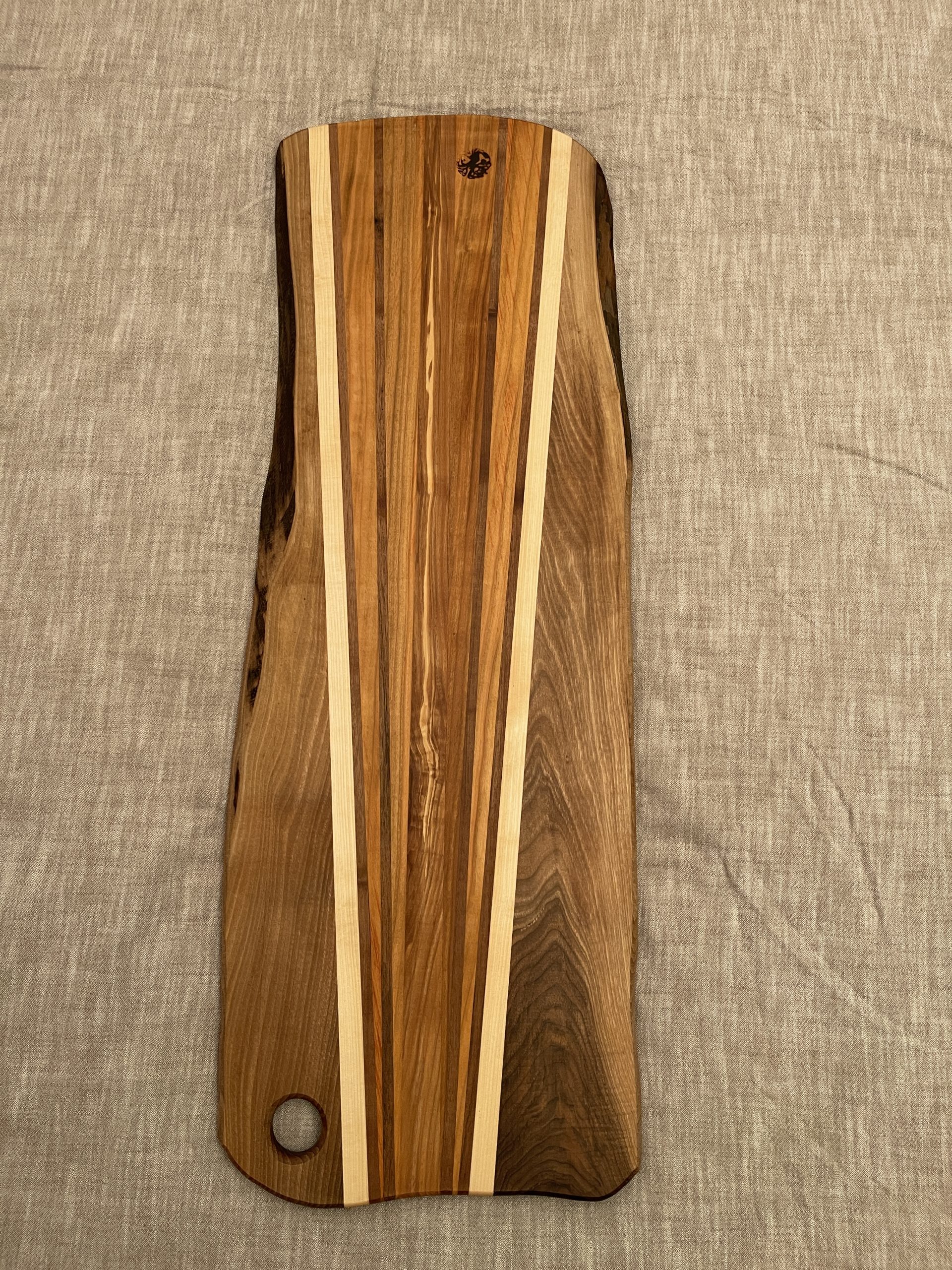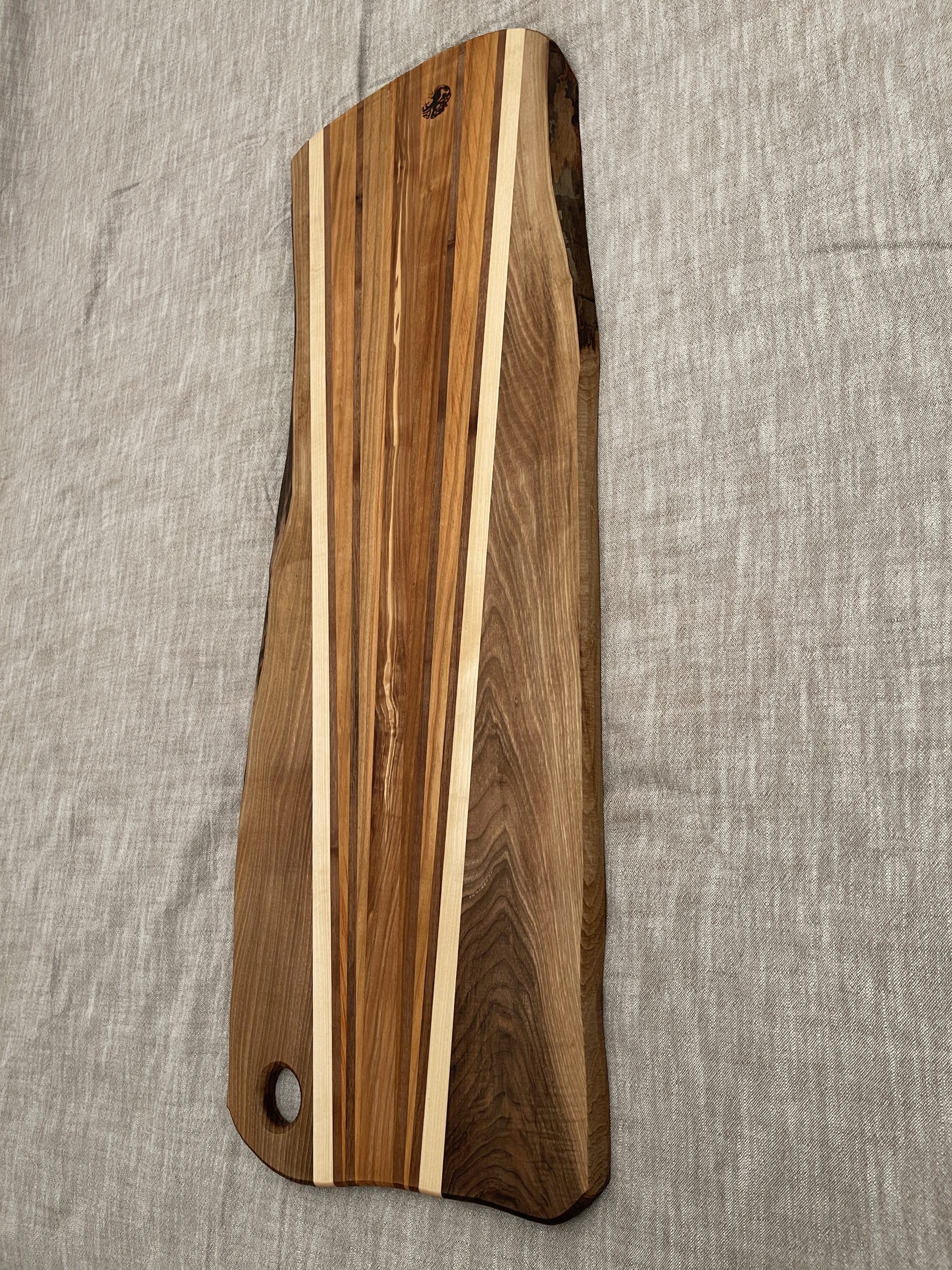 Brickan är uppbyggd av valkantsågat valnötsträ ytterst och sedan två ljusa stycken av lönn. Därefter är det kilformat trä av körsbär och valnöt som blandas och i mitten finns det en bit av alm med ett ljust mönster i sig. En klart annorlunda bricka med sitt mönster mot de andra.